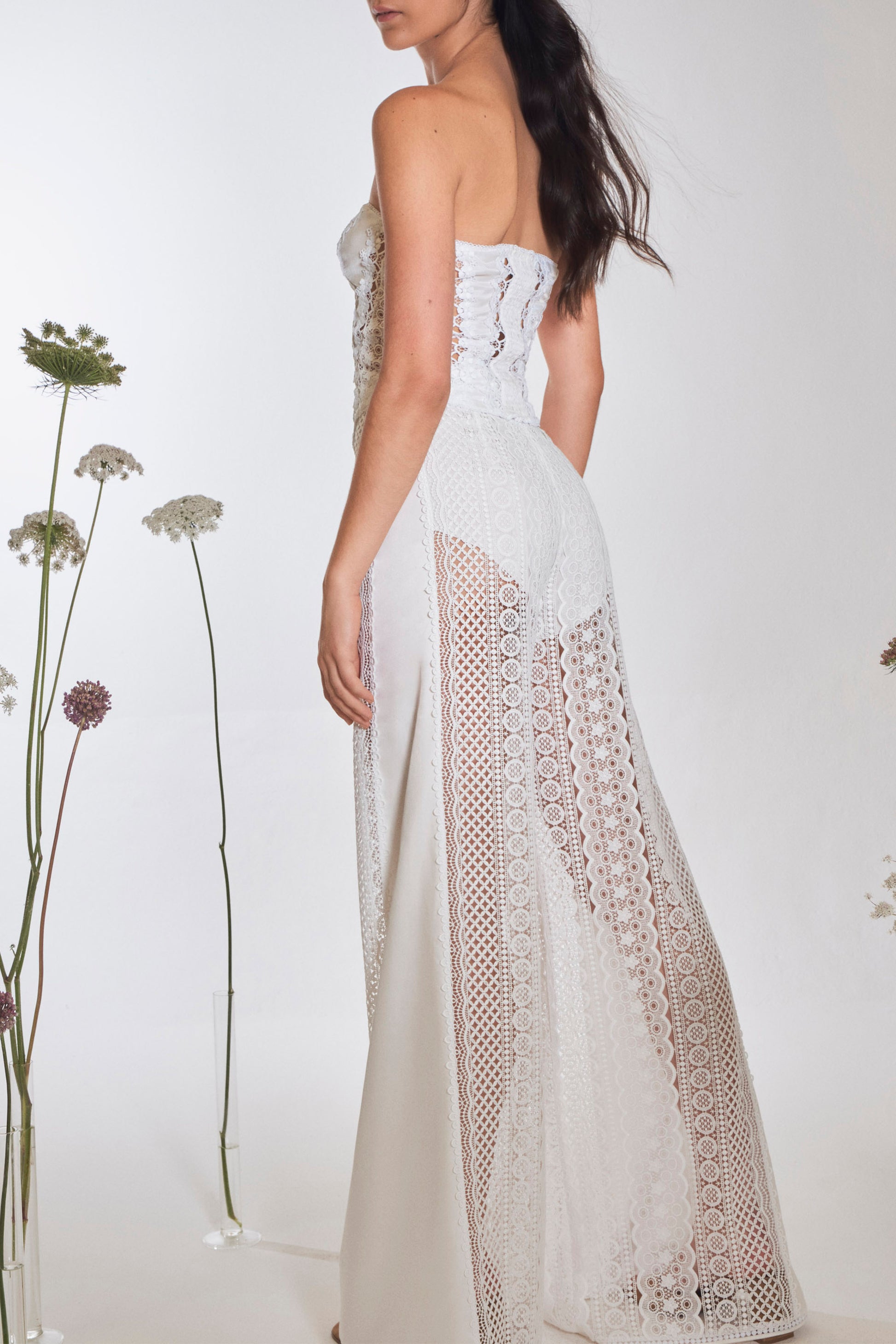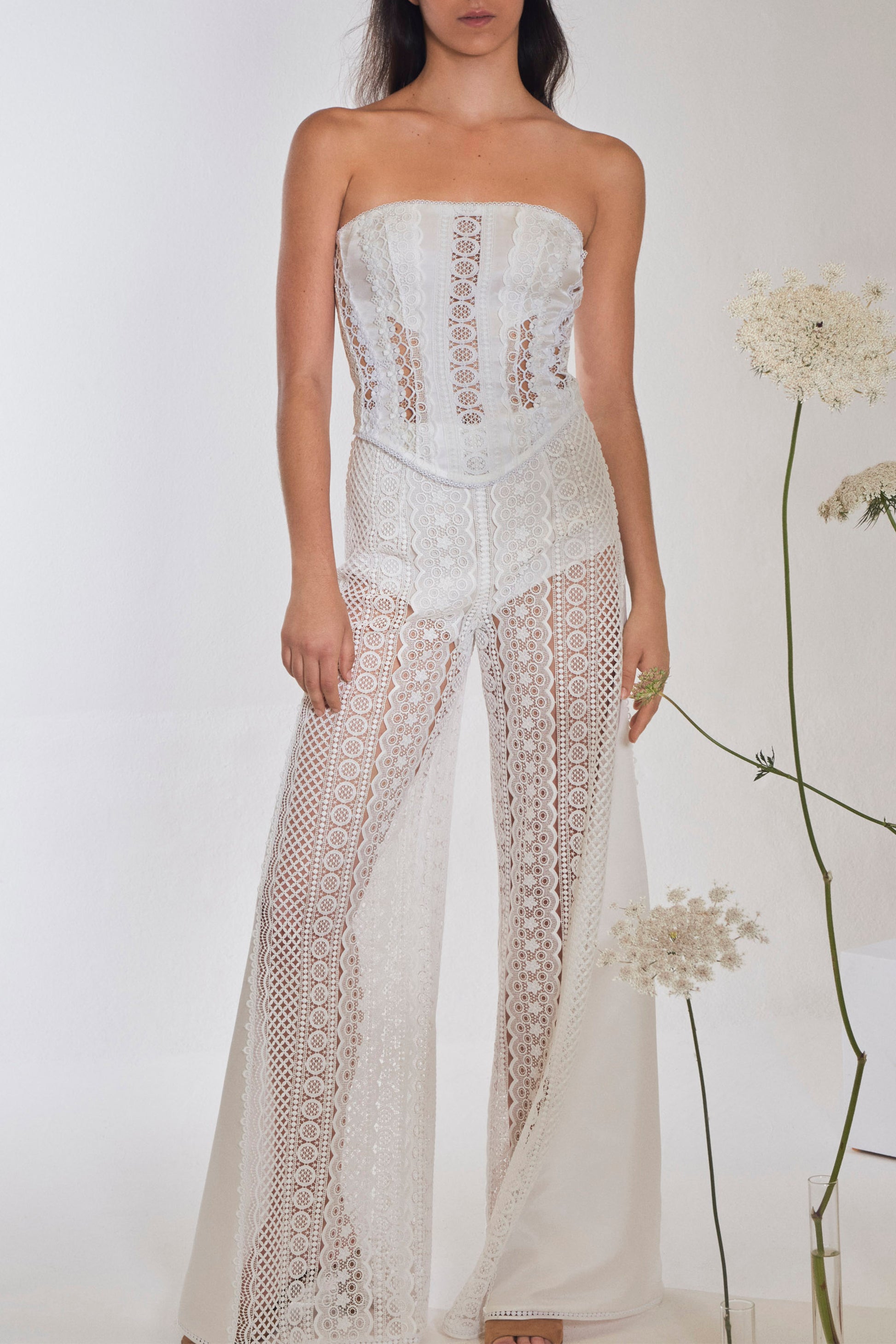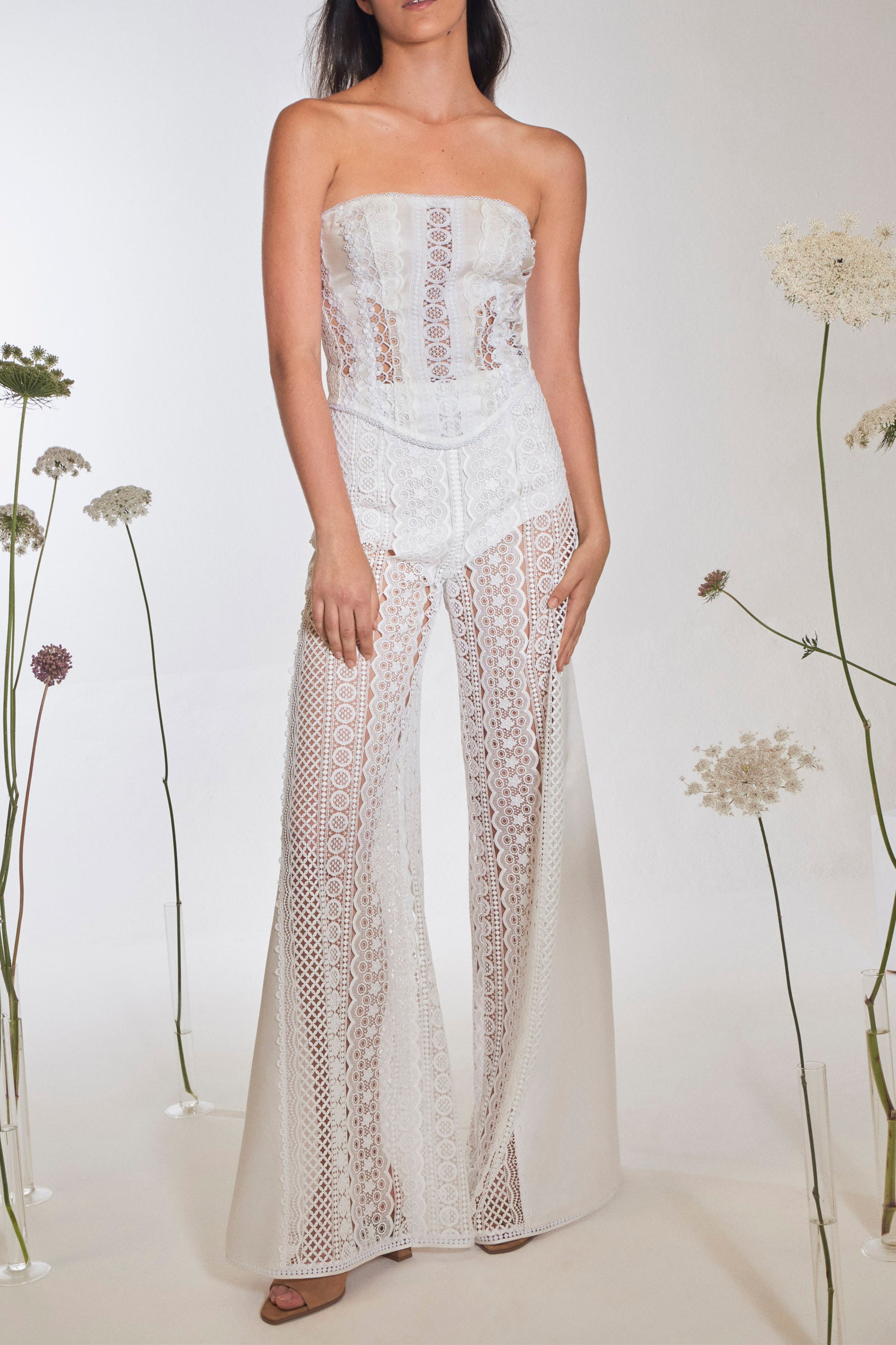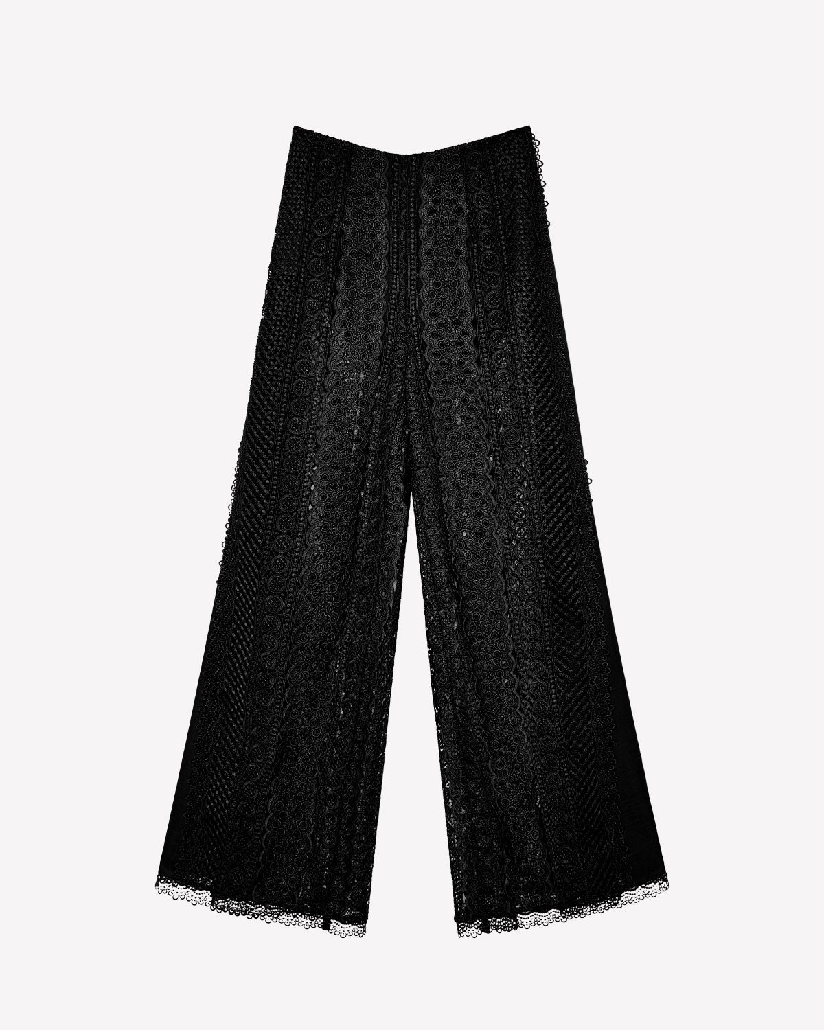 Nuestro pantalón de corte sastre ORSIE es la pieza perfecta para aportar a tus looks elegancia y sensualidad. Sus paneles verticales de guipures ricamente adornados alargan tu silueta y sus partes de seda con algodón acentúan tus piernas para crear la perfecta figura femenina. Su forro interior permite que tu piel se asome manteniendo tu comodidad.