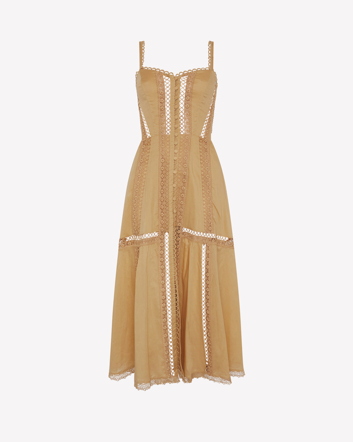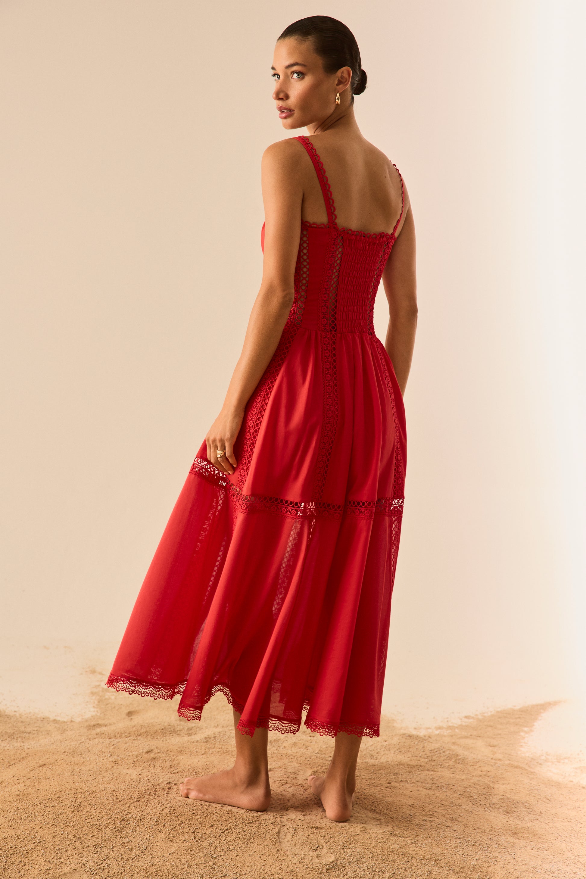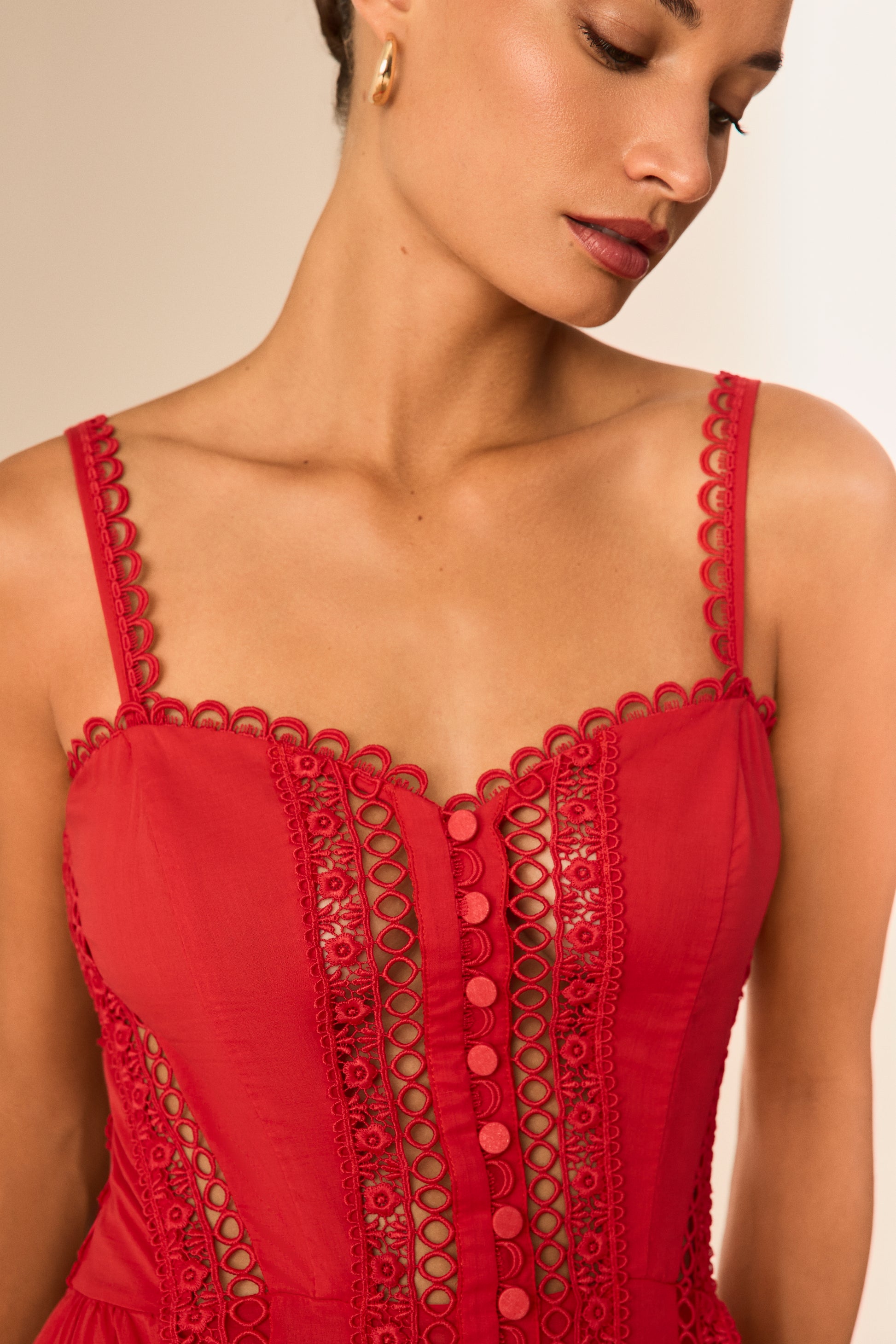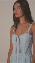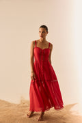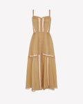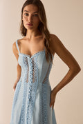 Descubre la elegancia vibrante del vestido DAFELLE, una silueta midi que combina estructura y ligereza con exquisito detalle. Confeccionado en voile de algodón y rematado con puntillas bordadas, presenta un escote corazón con tirantes finos y una botonadura central forrada que le otorgan un aire romántico y atemporal. El cuerpo entallado realza la figura con precisión, mientras que la falda larga aporta movimiento y sofisticación. Una pieza pensada para destacar en cualquier ocasión estival, con carácter y delicadeza.