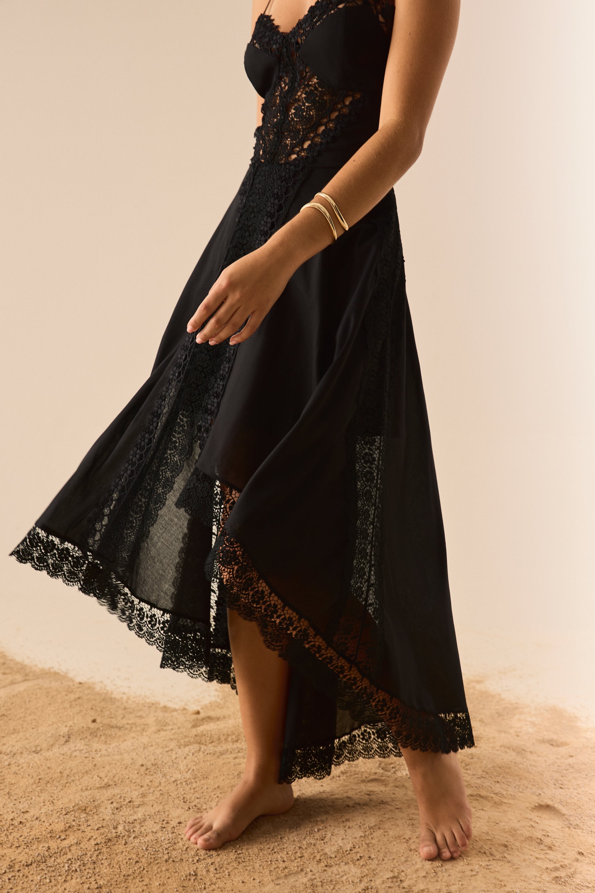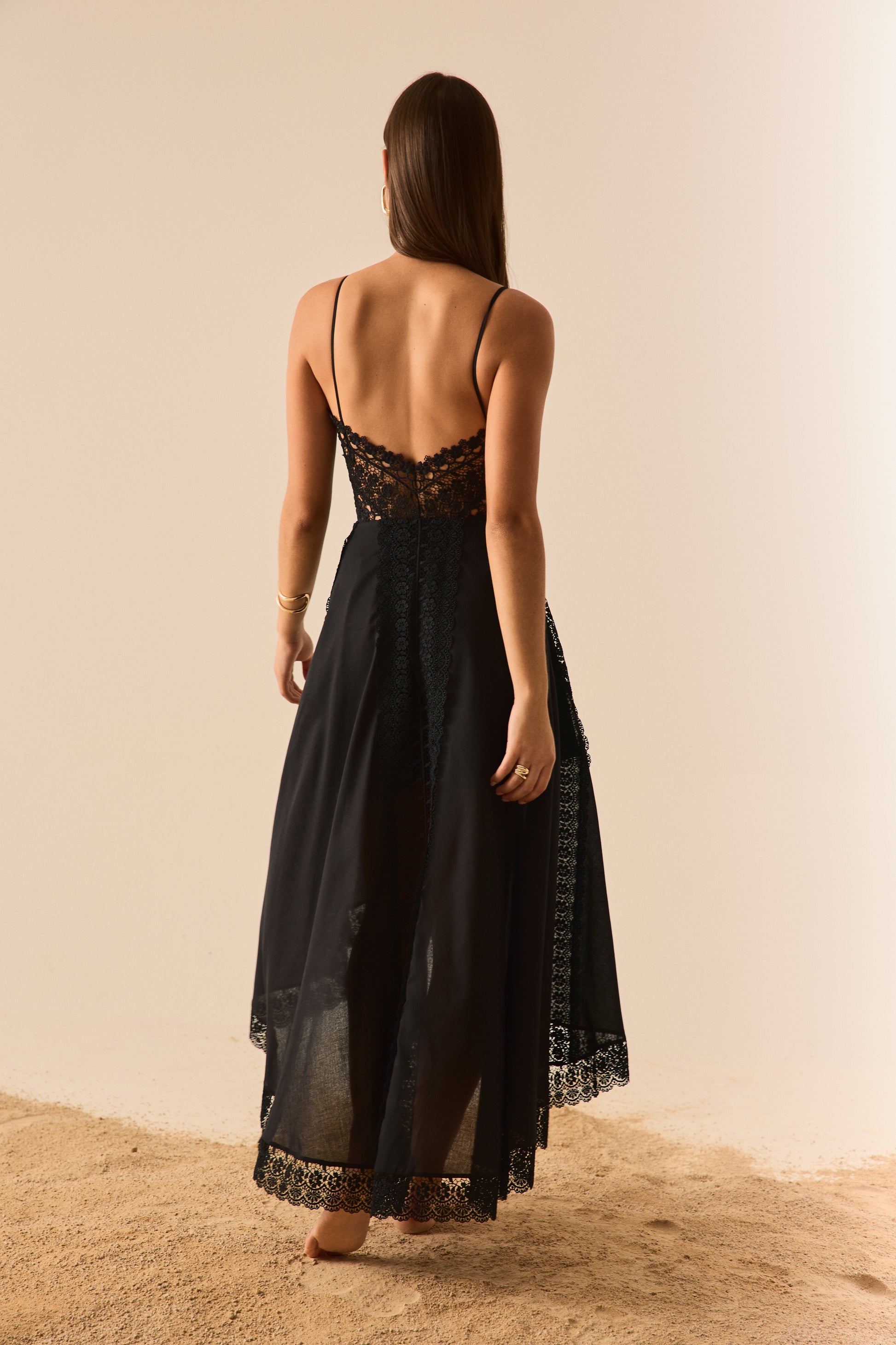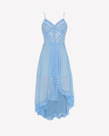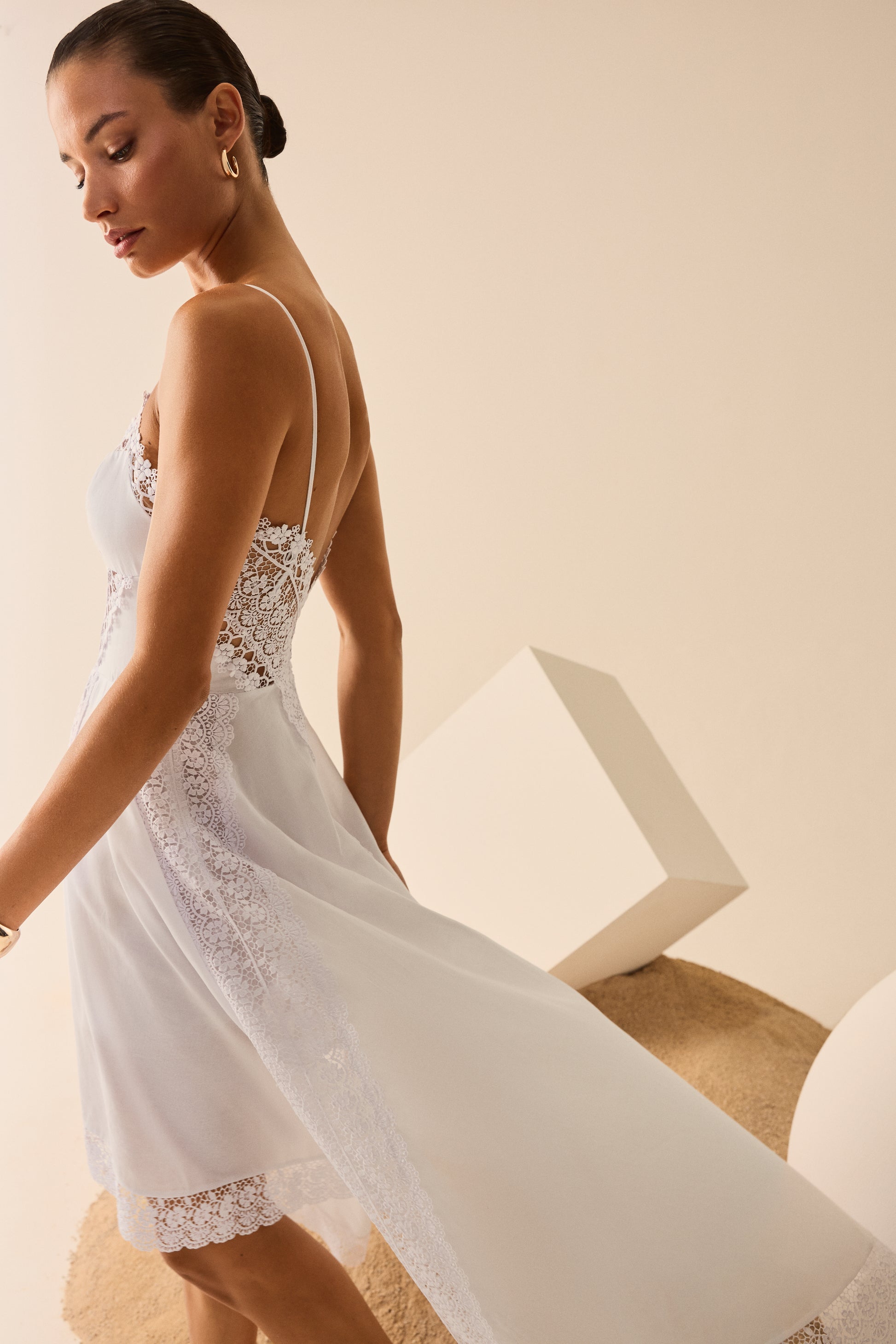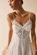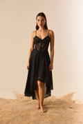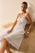 Descubre la sofisticación etérea del vestido NERIANE, una pieza que combina delicadeza y estructura en una silueta que fluye con naturalidad. Confeccionado en algodón con puntillas bordadas, presenta un escote con copa que realza el busto y tirantes finos que aportan ligereza. El diseño se enriquece con paneles de puntilla que recorren el cuerpo y caen hacia la falda, creando un efecto visual estilizado. Su falda asimétrica, más corta en la parte frontal y más larga en la trasera, añade dinamismo y un aire romántico, perfecto para ocasiones estivales especiales.