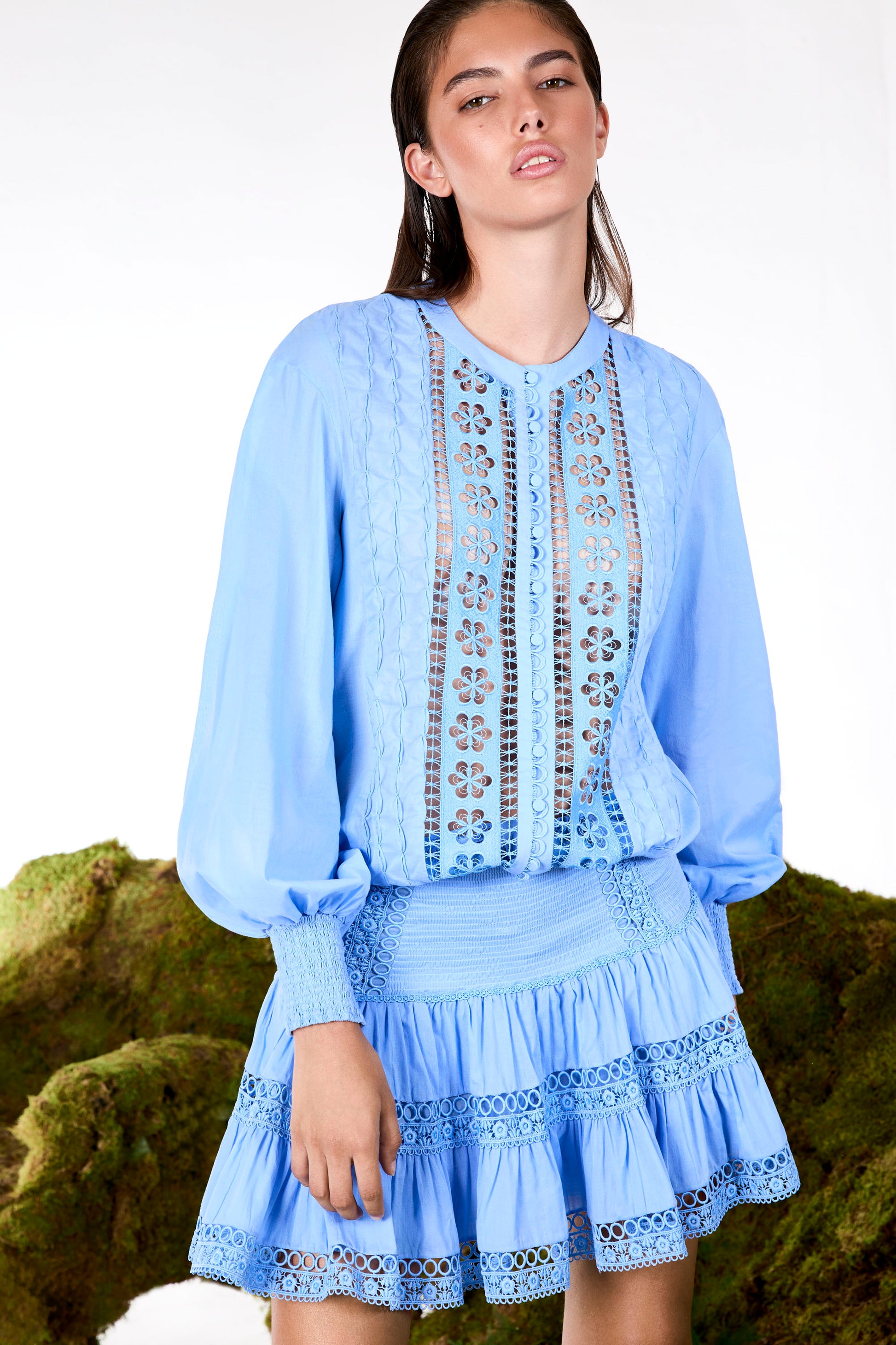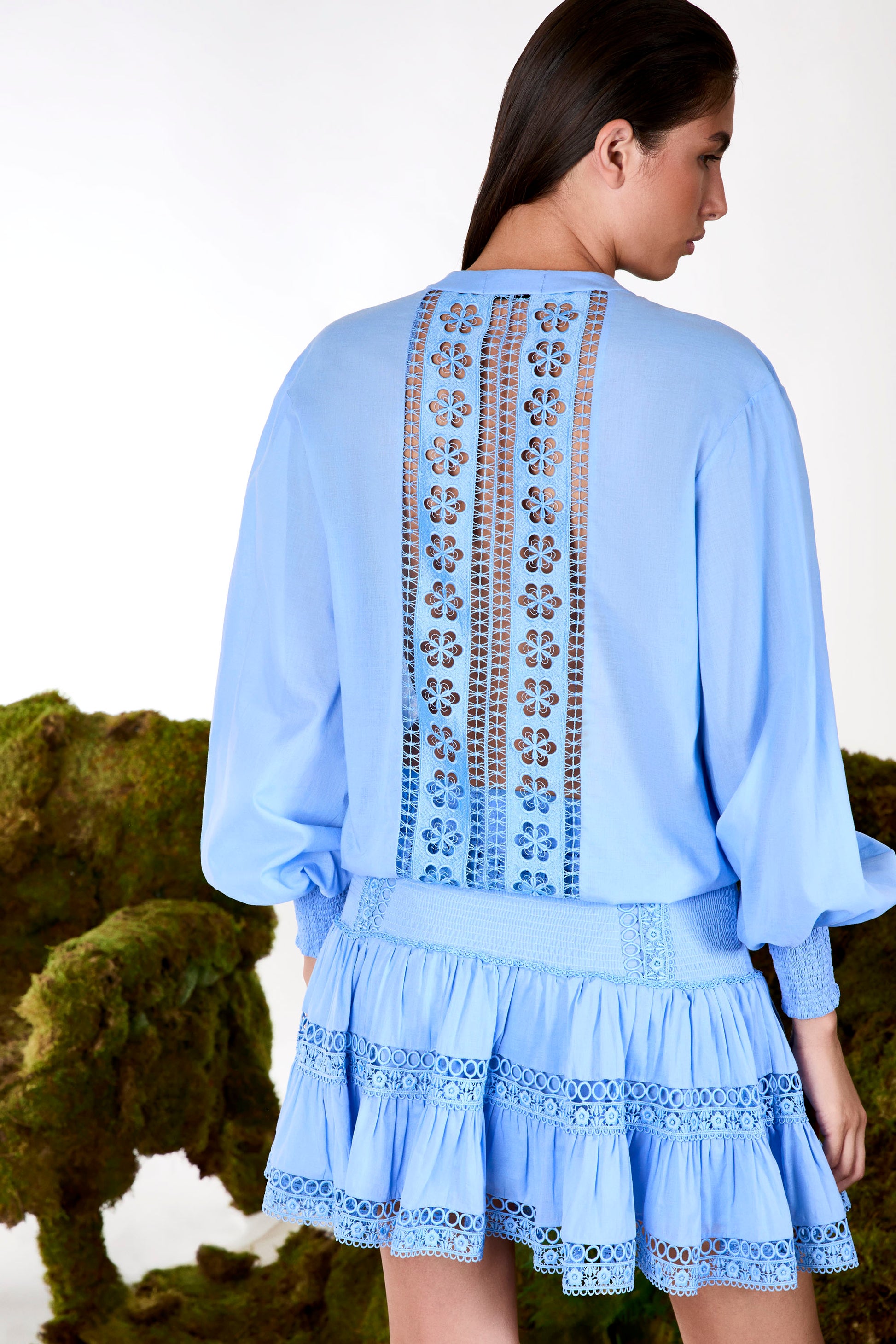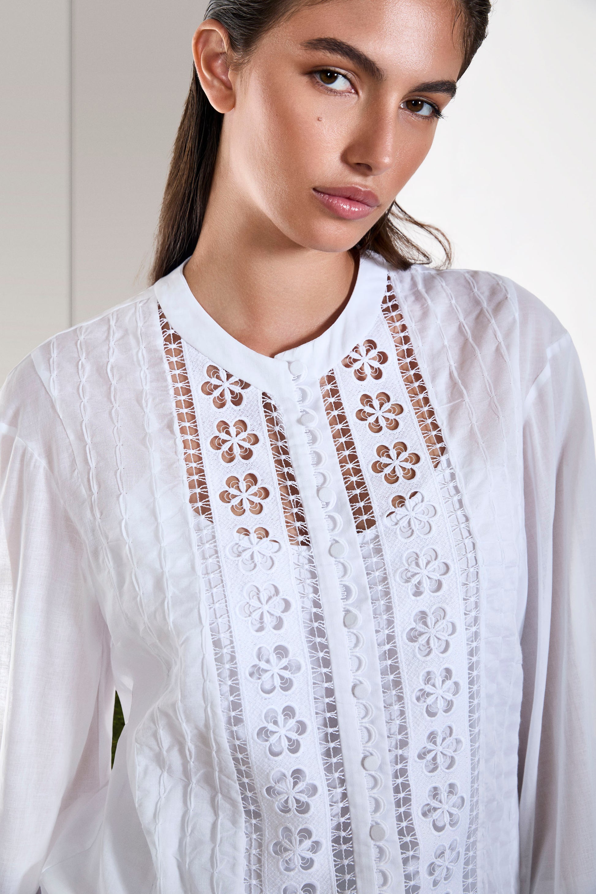 The DONNELIE blouse is the pinnacle of Ibizan spirit in a garment. Its lightweight cotton voile falls into beautiful puffed sleeves and its central part adorns the chest with exquisite guipures. Its central button placket allows you to play with the piece to create different styles. It comes with a separate undergarment for you to feel more comfortable.