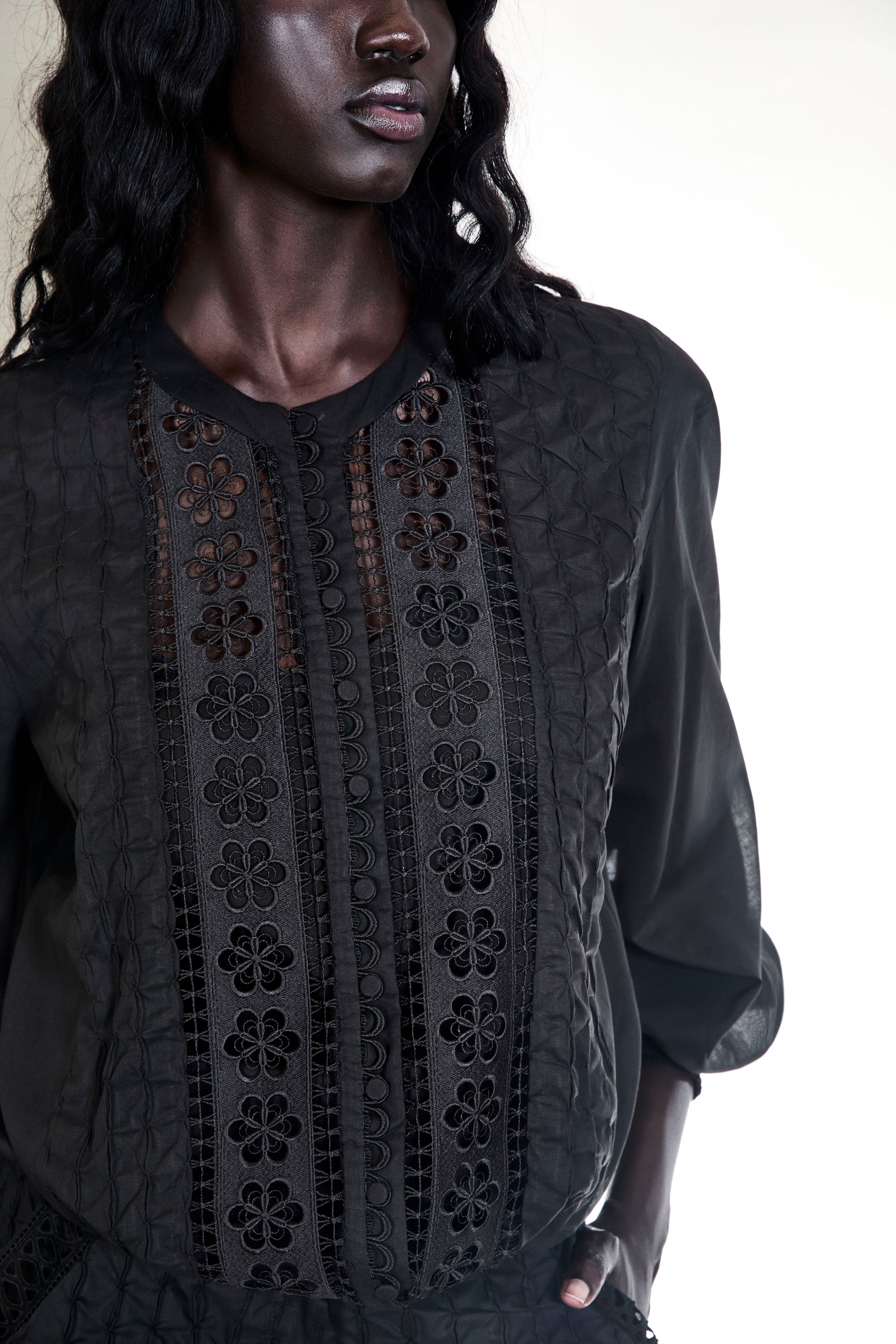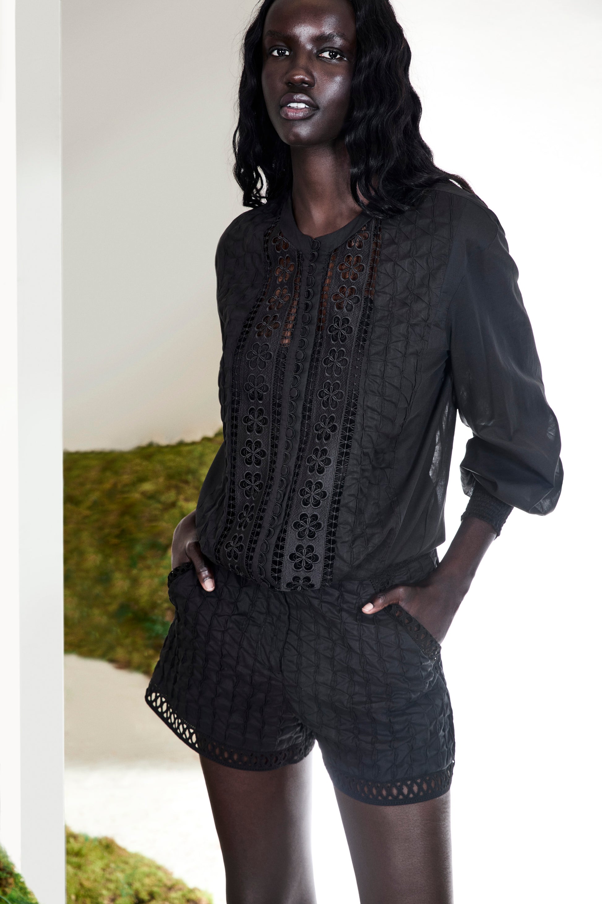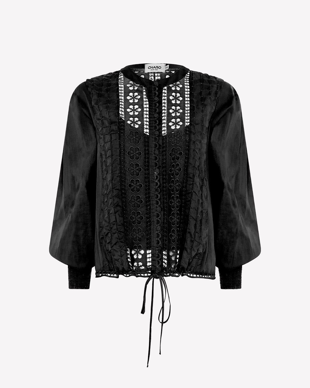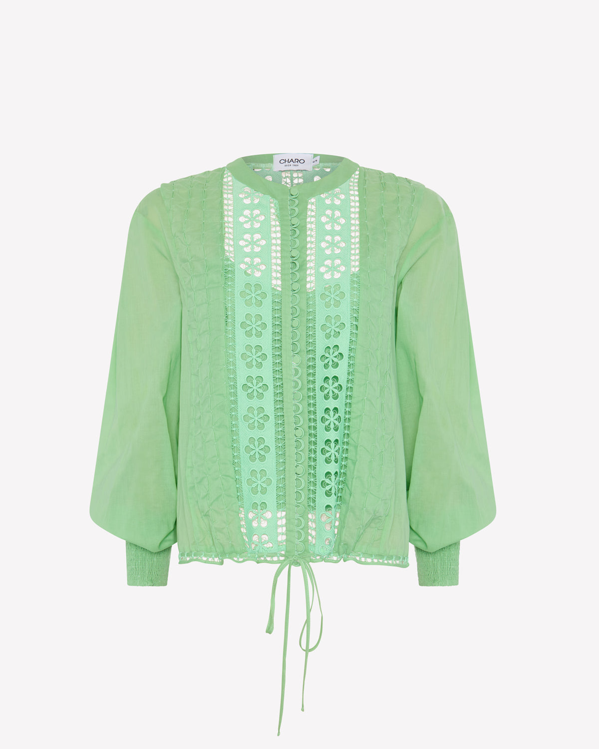 The DONNELIE blouse is the pinnacle of Ibizan spirit in a garment. Its lightweight cotton voile falls into beautiful puffed sleeves and its central part adorns the chest with exquisite guipures. Its central button placket allows you to play with the piece to create different styles. It comes with a separate undergarment for you to feel more comfortable.